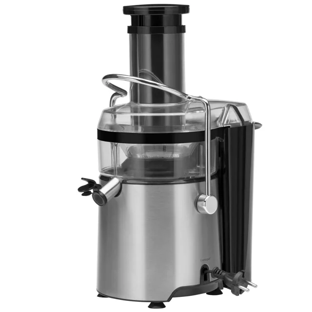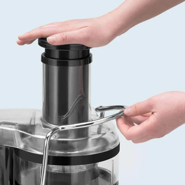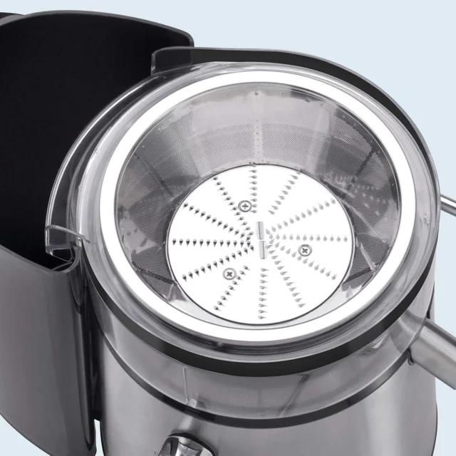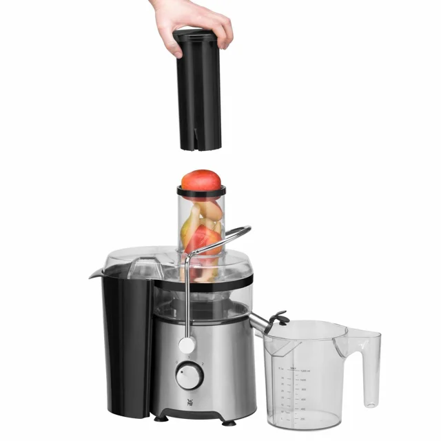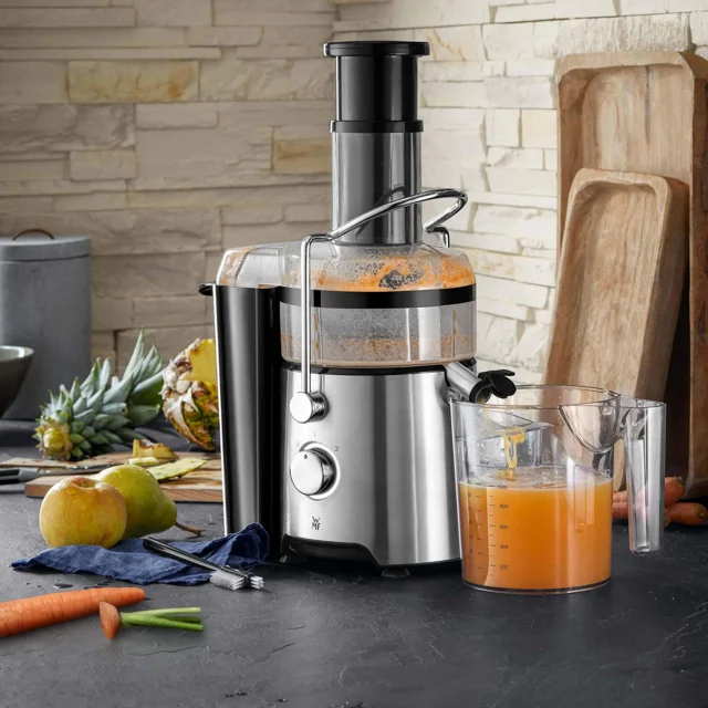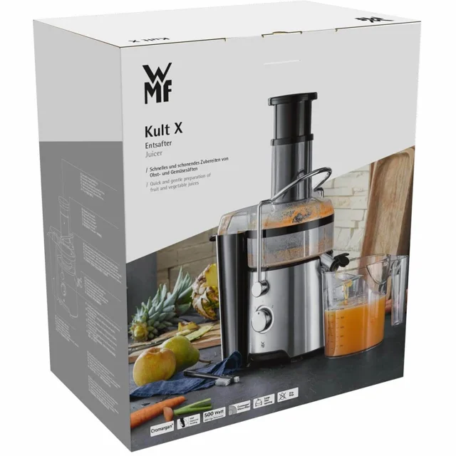 این روزها ، آب میوه های خوشمزه و سالم ، مهمتر از هر خوراکی دیگری در بسیاری از خانواده ها سر میز غذا هست . برای آماده سازی سریع ، آسان و ملایم ، آب میوه گیری WMF Kult X را با موتور 500 وات صرفه جویی در انرژی توصیه می کنیم . به لطف دهانه ورودی بزرگ 74 میلی متری که باعث صرفه جویی زیادی در زمان آماده سازی می شود و تیغه های فولادی با جنس کرومارگان و ظرف تفاله قابل جابجایی 1.8 لیتری و پارچ آب میوه 1.2 لیتر آب میوه در کمترین زمان آماده می شود .