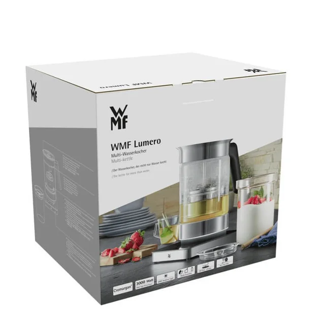 کتری برقی دبلیو ام اف مدل WMF Lumero Multi kettle یک دستگاه تقریباً همه کارها را انجام می دهد و همچنین زیباست که یک قهرمان واقعی در خانه مدرن است . پنج برنامه قابل تنظیم برای جوشاندن آب ، تهیه چای ، ماست و لعاب برای فوندوی شکلاتی ، و همچنین گرم کردن غذای کودک در یک محفظه شیک ساخته شده از کرومارگان مات با کیفیت بالا ، یک ابزار همه جانبه واقعی است . با حداکثر توان خروجی 3000 وات و ظرفیت نگهداری 1.6 لیتری . این کتری خیرهکننده دارای تنظیم دمای فوقالعاده دقیق از 40 درجه تا 100 درجه سانتیگراد است .