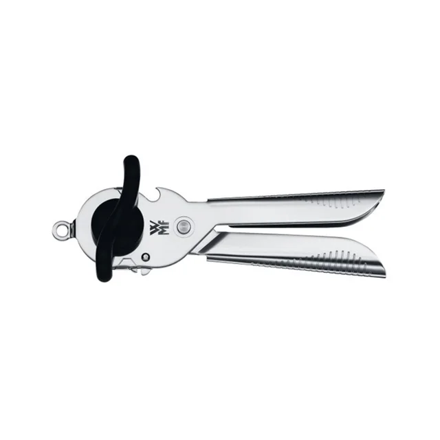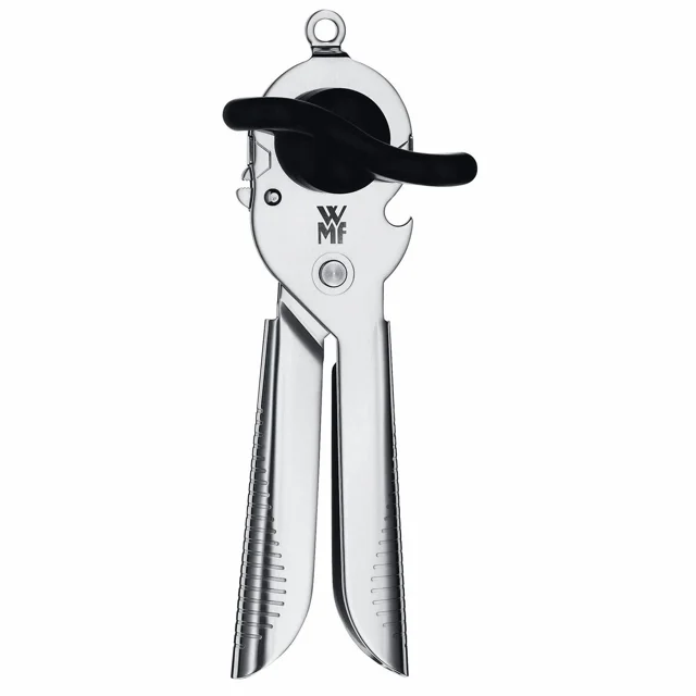 کنسرو باز کن دبلیو ام اف مدل WMF Tin opener Tin Up از استیل و فولاد کرومارگان ساخته شده که موجب مقاومت بالا و زیبایی آن می شود . کنسرو بازکن قوطی و بازکن بطری در یک وسیله است . دارای انبر برای گرفتن درب و حلقه انتهای دسته برای آویزان کردن . با این کنسرو باز کن هیچ لبه تیز روی قوطی یا درب باقی نمی ماند و به حدی تمیز برش میدهد که درب را می توان دوباره روی آن قرار داد .