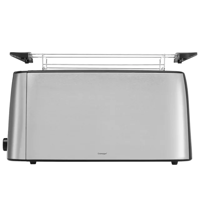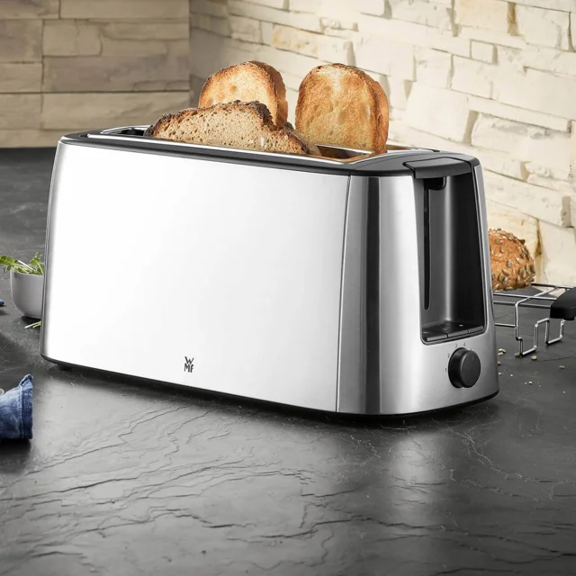 توستر های کمپانی WMF از ترکیب استیل و فولاد کرومارگان ساخته شده اند که نوید یک توستر با کیفیت را می دهد . این مدل تتوستر دبلیو ام اف WMF Bueno Pro Double long slot toaster که ساخته شده از فولاد کرومارگان است طراحی زیبا و مقاومت بالایی دارد ، از ویژگی های این مدل می توان به سه برنامه اتوماتیک و گنجایش توست با ضخامت 11 سانتی متر اشاره کرد که به همین دلیل می توانید هر ابعاد نان را در آن توست یا گرم و میل بفرمایید .